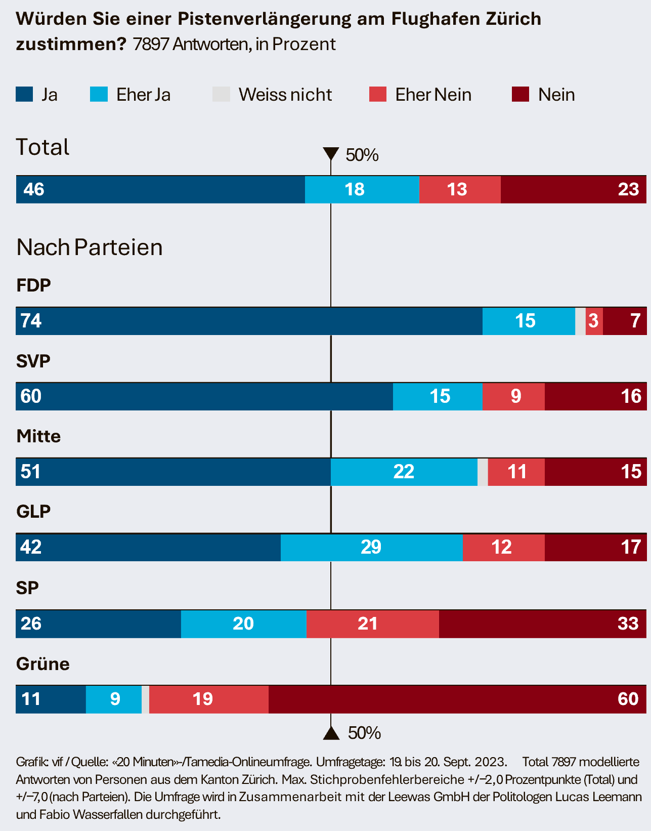 Wenig überraschend zeigt sich die Verteilung der Befürworter nach parteipolitischer Zugehörigkeit: Mitte-rechts ist eindeutig dafür. Entgegen der GLP-Kantonsrätinnen und -räten befürwortet die GLP-Wählerbasis die Pistenverlängerungen mit über 70 Prozent klar.